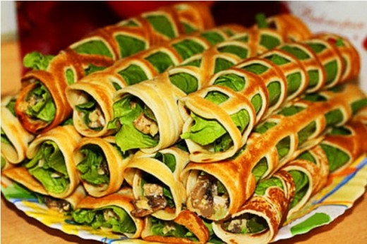 Когда блины остынут, заворачиваем в них начинку. К примеру, можно сделать пасту из мягкого сыра и чеснока. Выложить на блин лист салата и намазать сырной начинкой. Также можно "нафаршировать" ажурные блины омлетом, твердым сыром, овощами и другой начинкой - на ваш вкус.