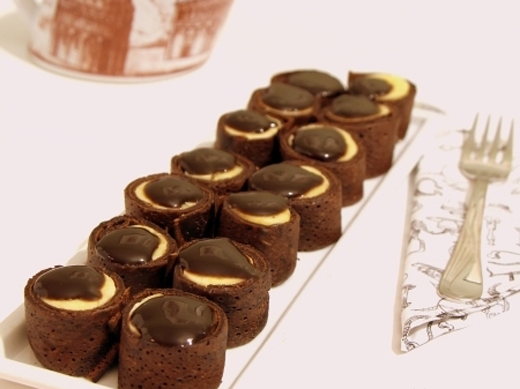 Затем растапливаем шоколад на водяной бане (напоминаю, это можно сделать в микроволновке). Можно заменить на шоколадную пасту. Жидким шоколадом поливаем каждый блин. Чистим бананы и кладем их на блины (если фрукты слишком длинные, режем их соразмерно диаметру блинов). Сворачиваем ролл. Даем шоколаду "схватиться" и разрезаем ролл на кусочки по 2-3 сантиметра. Посыпаем корицей или сахарной пудрой, поливаем оставшейся глазурью и подаем на стол.