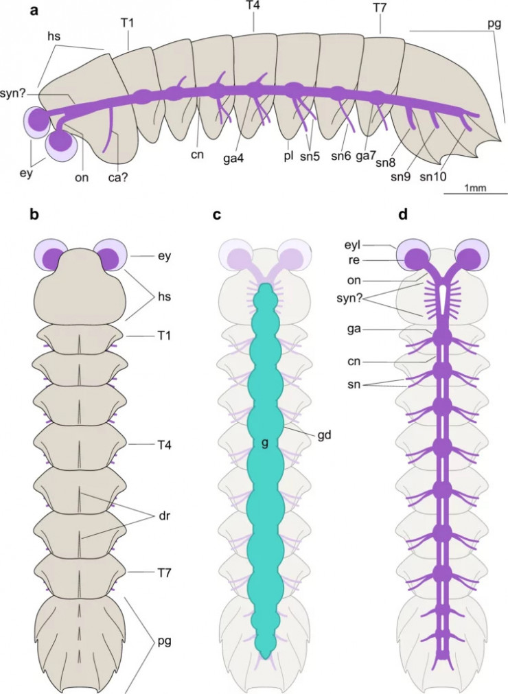 Внутренне устройство Mollisonia symmetrica: фиолетовым показана нервная система, голубым — пищеварительная © J. Ortega-Hernández et al