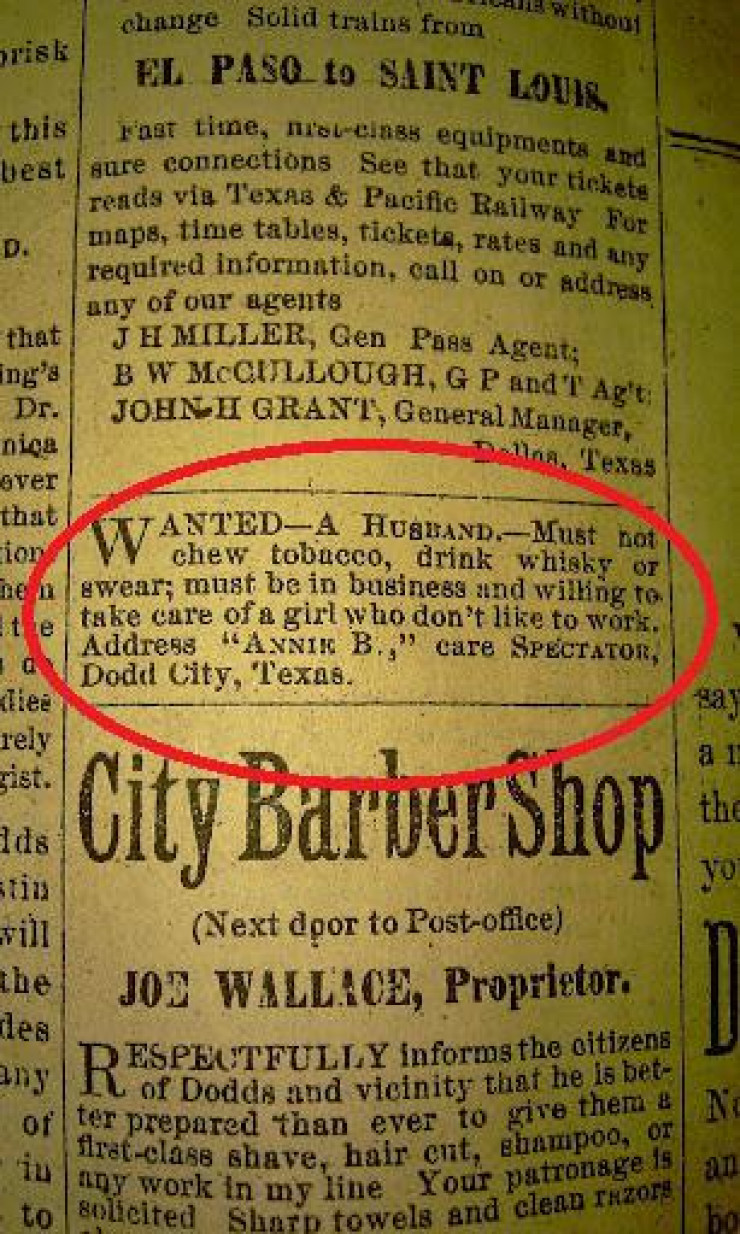 Фотографию необычного объявления в газете 1888 года выложил на портал Reddit пользователь под ником djbryanc. Как свидетельствует текст, одинокая женщина из Додд-Сити в штате Техас искала мужа. У нее были строгие критерии, которым будущий муж должен был соответствовать.