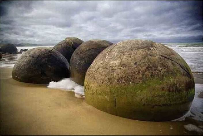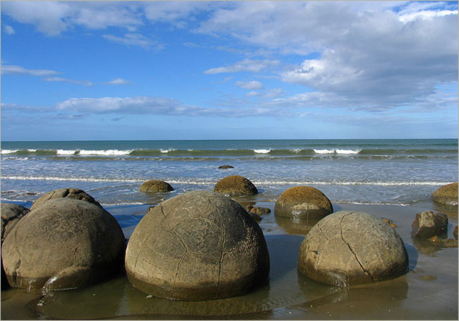 В Новой Зеландии шары в песках пляжа вдоль побережья омываются морским прибоем.