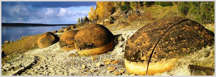 Шаровидные конкреции в реке Ижма, республика Коми.