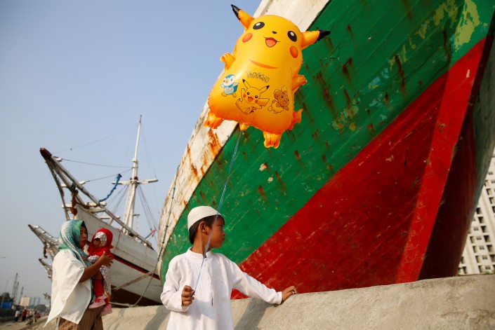 Мальчик в ожидании парома после посещения совместной молитвы в честь праздника. Джакарта, Индонезия.