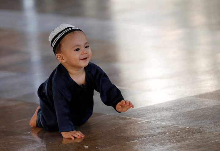 Малыш играет в мечети перед утренним намазом в первый день празднования окончания поста. Бангкок, Таиланд.