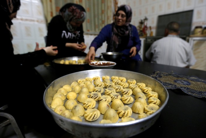 Семья, семь лет назад бежавшая из Сирии, готовит традиционные сладости в честь праздника. Амман, Иордания.