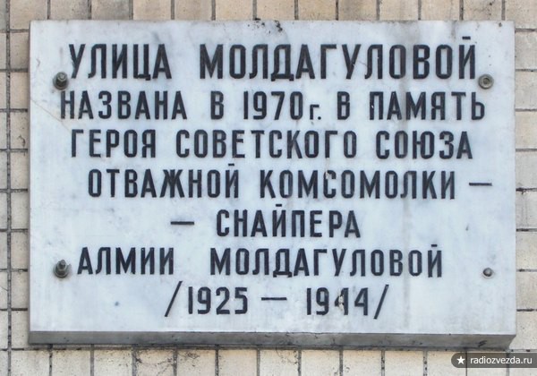 В крупных городах России, Москве и Санкт-Петербурге, есть улицы, названные в честь Алии Молдагуловой как дань памяти мужеству, отваге и самопожертвованию девушки-снайпера из Казахской АССР.