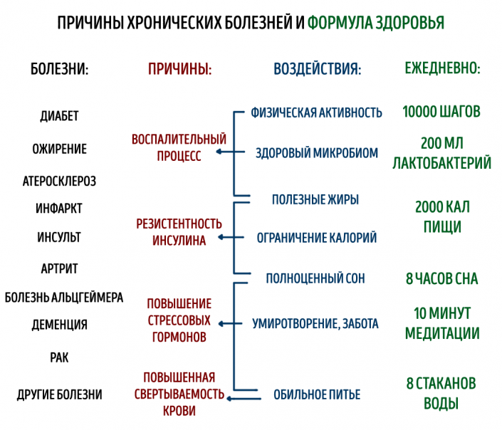 Учитывая новый взгляд на причины распространенных хронических заболеваний, важно по-иному оценить механизм влияния на источник недуга. Наукой доказано, что хроническое воспаление успешно подавляется благодаря регулярной физической активности, а инсулин можно укротить не только благодаря ограничению пищевых калорий, но и за счет потребления полезных жиров, а также полноценного сна. Конечно, не всегда удается избежать стрессовых ситуаций, но забота и внимание близких – это надежный путь к умиротворению.