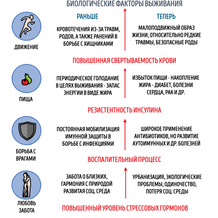 Если ко всему этому добавить хронический выброс стрессовых гормонов из-за токсической социальной среды и психологических проблем, то удивляться нечему: сегодня мы имеем дело с беспрецедентным ростом хронических заболеваний, таких как диабет, ожирение, гипертония, коронарная болезнь сердца, рак, болезнь Альцгеймера, деменция, ревматоидный артрит. Ими, в той или иной степени, сегодня страдает более половины человечества.