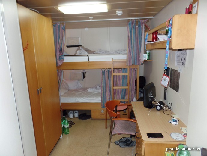 Что сказать… Порт там прямо в поле. Вокруг пустота, глазу не на чем задержаться. Думаю: куда я попал? А потом было первое знакомство с каютой, и снова шок: разве здесь можно провести хотя бы месяц?.. Нас водили по лайнерам, но в жилую часть мы не заглядывали, чтобы не мешать команде. И вот захожу в каюту - а она, мягко говоря, небольшая. Стоит двухуровневая кровать, есть душевая (тут нам сильно повезло), небольшой холодильник, стол и телевизор. Соорудил себе подобие полочек возле кровати. В итоге привык.