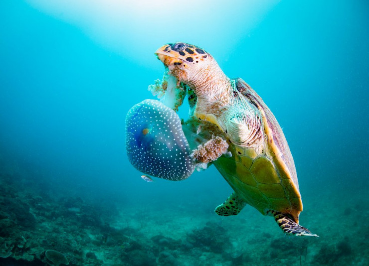 "Мне повезло снять эту однорукую зеленую черепаху, которая наслаждалась завтраком из медузы. Раньше за зелеными черепахами охотились ради создания украшений, теперь они занесены в Красную книгу. Пластиковый мусор и рыболовные сети угрожают их выживанию", - сказал автор снимка.