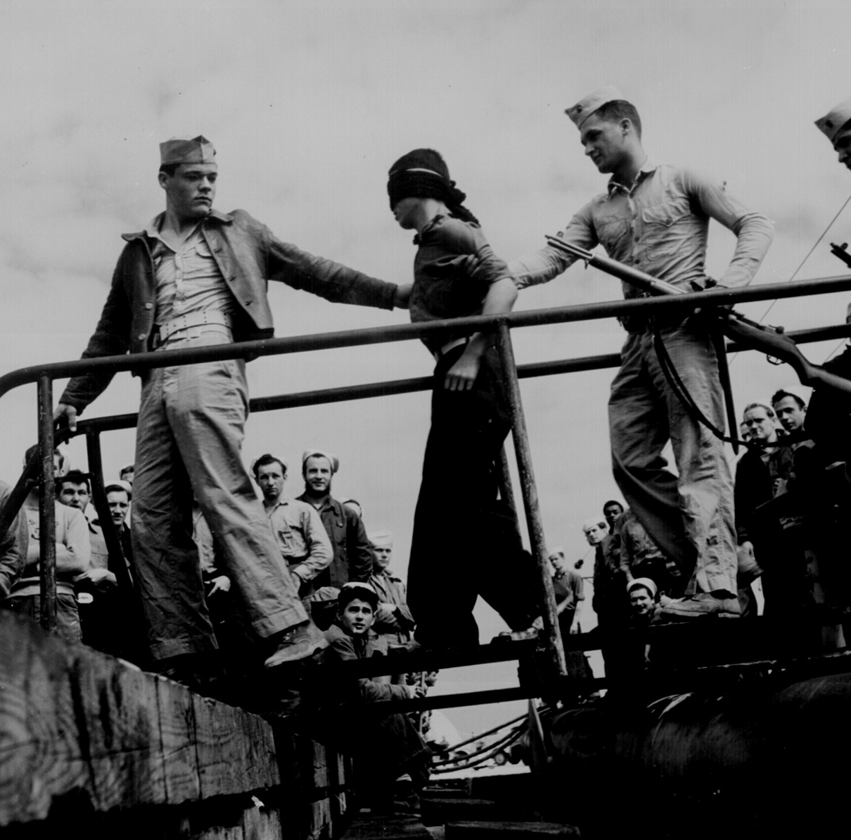 Американские морские пехотинцы выводят японского военнопленного с борта американской подводной лодки, май 1945 года.