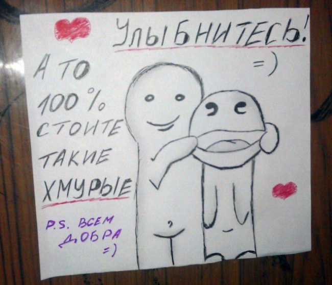 В каждом доме, дворе или подъезде обязательно найдутся люди, которые делают жизнь окружающих людей пусть немного, но веселее. Они не заканчивали художественных академий, но это не мешает им творить, писать шедевральные объявления, разрисовывать стены и бороться за справедливость. В этом материале AdMe.ru выбрал лучшее из того, что было придумано самыми обычными людьми в апреле. Наслаждайтесь и умиляйтесь.