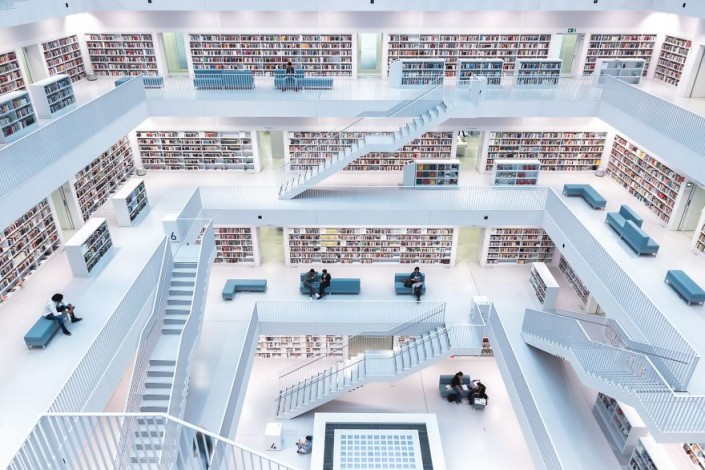 Городская библиотека в Штутгарте, Германия, наполнена естественным светом. Большие окна, открытое пространство и белый пол создают уникальную атмосферу для пополнения знаний и хорошего кадра.