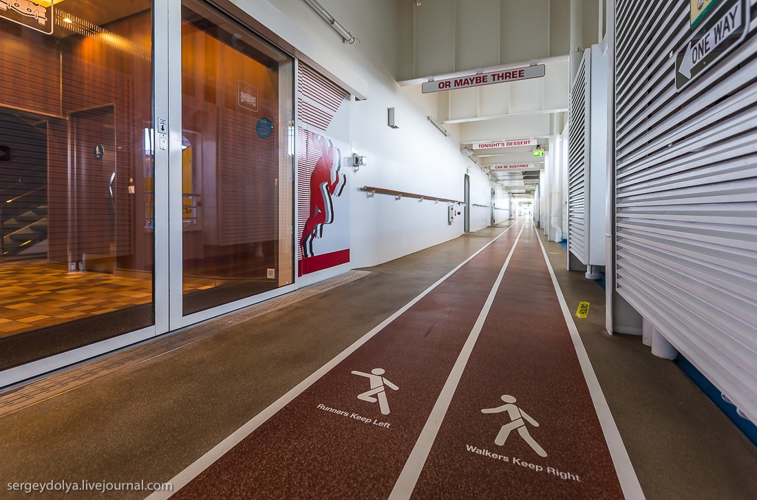 Палуба на уровне пятого этажа выходит к спасательным шлюпкам. Она идет по всему лайнеру, и сюда выводят людей при внештатных ситуациях. Чтобы место не пропадало зря, его используют как беговую дорожку. Так часто поступают пассажиры больших кораблей, но только здесь специально разметили дорожки для бега и спортивной ходьбы. Согласовано даже направление, чтобы не сталкиваться друг с другом. Полный круг - 700 метров.