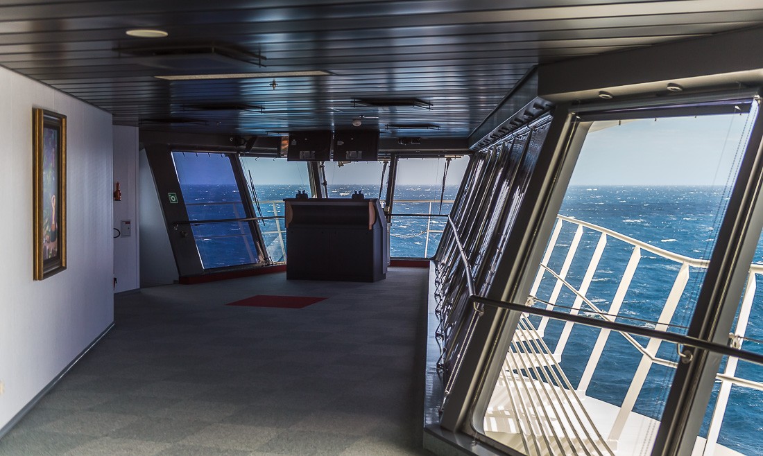 У корабля нет штурвала. Три винта двигателя вращаются на 360 градусов, их выставляют либо вручную с помощью трех вращалок (на переднем плане фотографии), либо с помощью компьютера. Система следит за курсом и подруливает.
