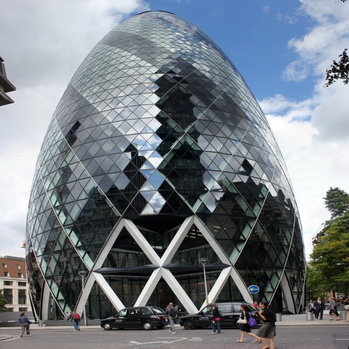 Небоскреб Мэри-Экс (или Огурец, Корнишон) в Лондоне, Великобритания. Архитектор Норман Фостер.