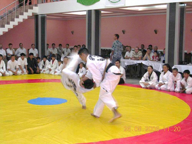Демонстрация приемов хапкидо, сдача на черный пояс для комиссии в Узбекистане