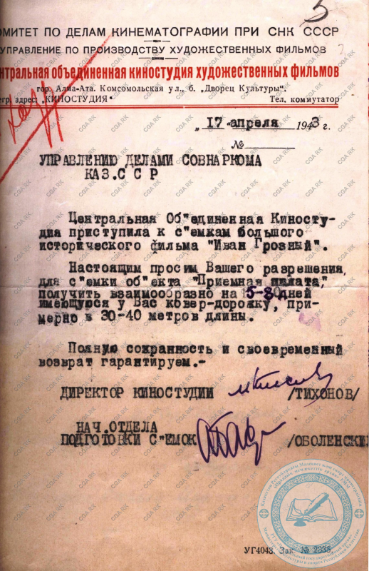 К слову сказать, Совнарком Казахстана нередко оказывал содействие и в вопросах "доставки" реквизитов. К примеру, 17 апреля 1943 года директор Объединенной киностудии М. Тихонов обратился в Управление делами правительства республики с необычной просьбой, а именно о выделении для съемок исторического фильма "Иван Грозный" ковровой дорожки длиною 30-40 метров, имеющуюся, по его разумению, в запасниках СНК.