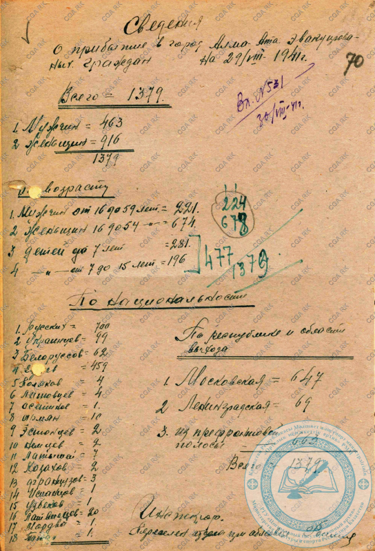 В 1941-1943 годы только в самой столице республики Алма-Ате нашли временный приют и продолжили свою работу Академия наук Союза ССР, Союз писателей, Союз художников, Мосфильм, Ленфильм, высшие учебные заведения, эвакогоспитали и другие учреждения.