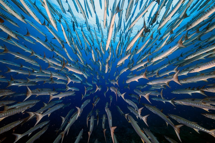Фотограф провел пять дней, плавая со стаей барракуд в Голубом углу Палау, прежде чем сделать этот снимок, который стал победителем в категории "Водная жизнь". Юн-Сен Ву в течение пяти дней ежедневно бросал вызов течениям, пытаясь завоевать доверие барракуд, чтобы запечатлеть этот поразительный момент.