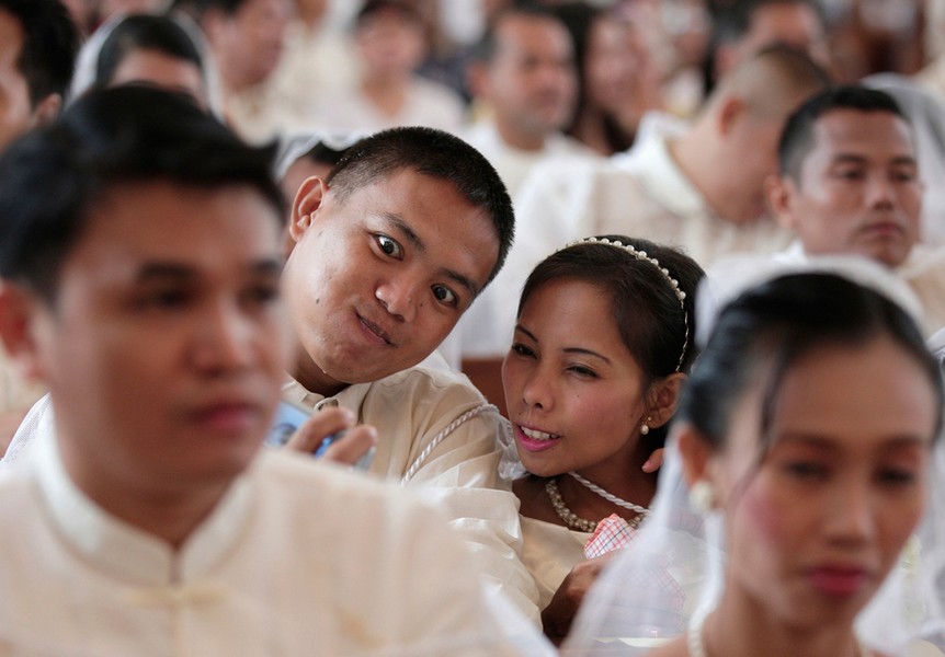 4. Влюбленные делают "селфи" во время массовой свадьбы в одной из католических церквей в столице Филиппин Маниле.