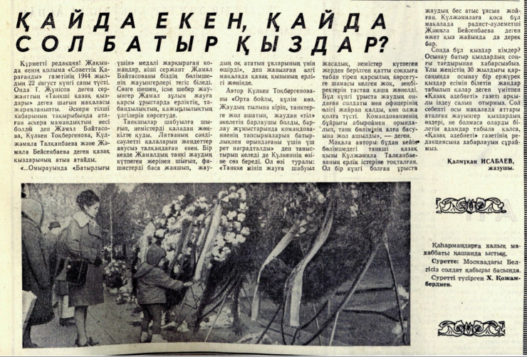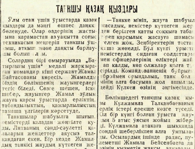 Впервые о девушках-казашках из Карагандинской области, которые во время Великой Отечественной войны били врага в составе танкового экипажа, земляки узнали из областной газеты "Советтік Қарағанды" от 22 августа 1944 года. Материал был прислан с фронта младшим сержантом Жунусовым Топатаем. Восхищаясь их мужеством, он писал: "Отважные подвиги девушек младшего сержанта Жамал Байтасовой, Кулькен Токбергеновой, Кульжамилы Талканбаевой и радистки-пулеметчицы Жамили Бейсенбаевой преисполняют гордостью казахский народ. Пусть и дальше возносится слава казахских девушек-танкисток!"