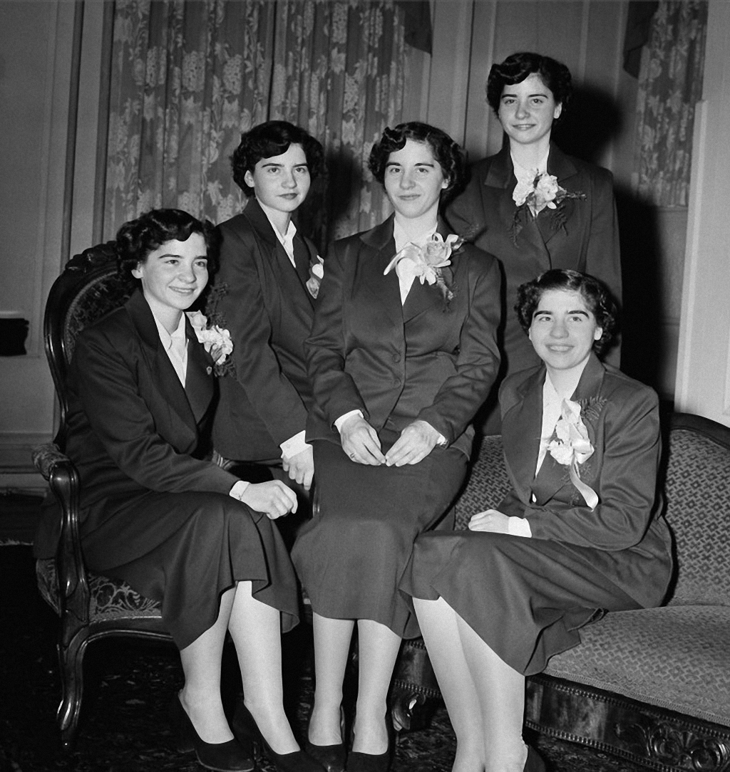 Когда сестрам исполнилось 6 месяцев, их отец принял решение показать своих дочерей на Всемирной выставке в Чикаго. Об этом узнали канадские власти, которые решили заняться организацией необычного показа. Для девочек был выстроен специальный павильон с десятью огромными окнами и галереей, чтобы малышек было лучше видно. На фото: сестры Анетт, Сесиль, Эмили, Мари и Ивонн в 1936 году.