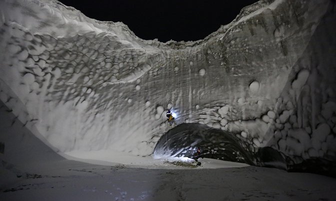 Спуститься в воронку летом у исследователей не получалось из-за постоянного обрушения грунта. В этот раз участники экспедиции спустились на глубину в 200 метров при порывах сильного ветра, скорость которого достигала 20 метров в секунду.
