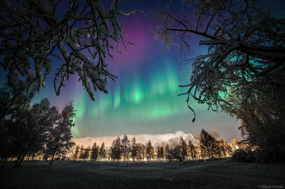 Полярное сияние в Архангельске. Оно возникает при столкновении солнечного ветра с магнитным полем Земли и случается не только у Северного и Южного полюсов. Известны случаи, когда полярное сияние видели в Греции.