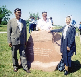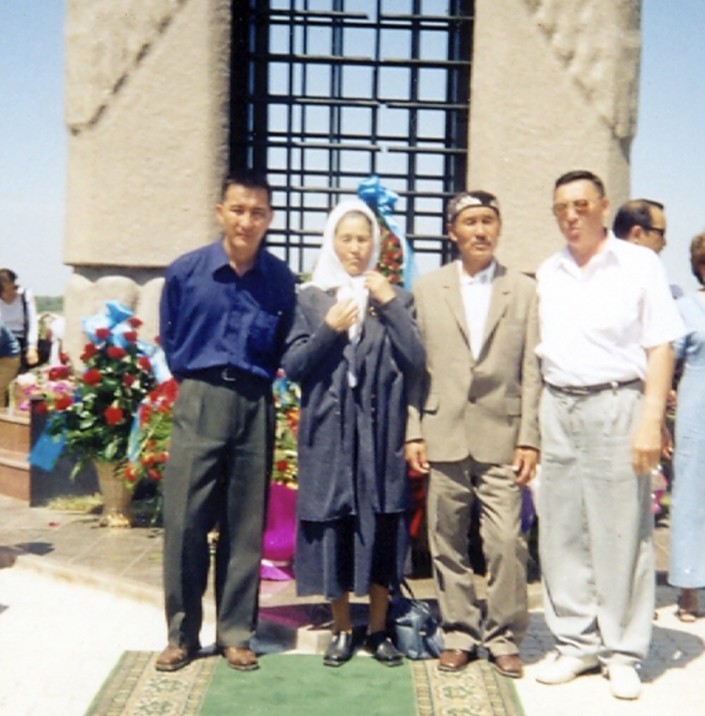Младший брат Садуакасова Курман, двоюродный брат Абдисагит и младшая сестра Онал у монумента, посвященного жертвам репрессий. 2002 год. Алматы.