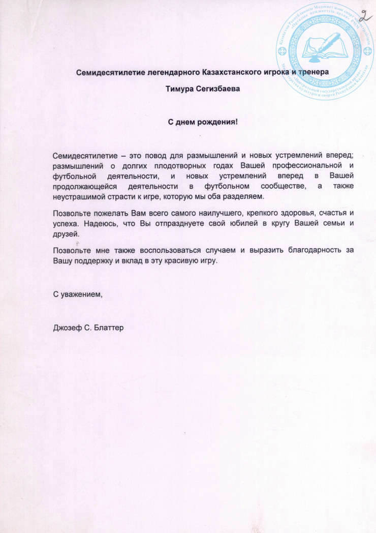 Поздравление от президента ФИФА Джозефа С. Блаттера Сегизбаеву Т.С. с 70-летием, 2011 г. ЦГА РК