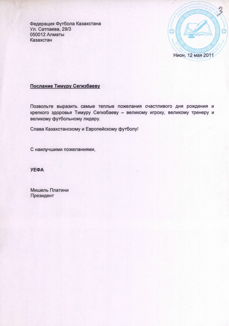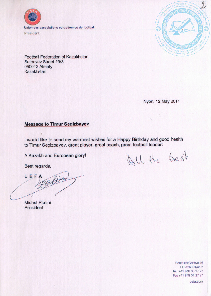 Поздравление от президента УЕФА Мишеля Платини Сегизбаеву Т.С. с 70-летием, 2011 г. ЦГА РК