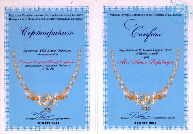 Сертификат Сегизбаева Т.С. к Золотому ордену Национального олимпийского комитета Республики Казахстан, 2011 г. ЦГА РК