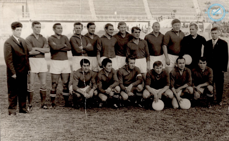 Ветераны футбольного клуба "Кайрат". 1-й ряд слева направо: Анторян Р., Бекбосынов Б., заслуженный тренер Казахской ССР Котляров В., Остроушко Л., Чуваков В., Пономарев В.; 2-й ряд слева направо: Сентюков В., Каминский С., Сегизбаев Т.С., Мороз В., Киселев В., Акимов Ю., Кузнецов Е., Леонов Б., Буйлов Ю., Каретников Б., не установлен, заслуженный тренер Казахской ССР Зенкин П.Г. 1970 г. Алма-Ата. ЦГА РК