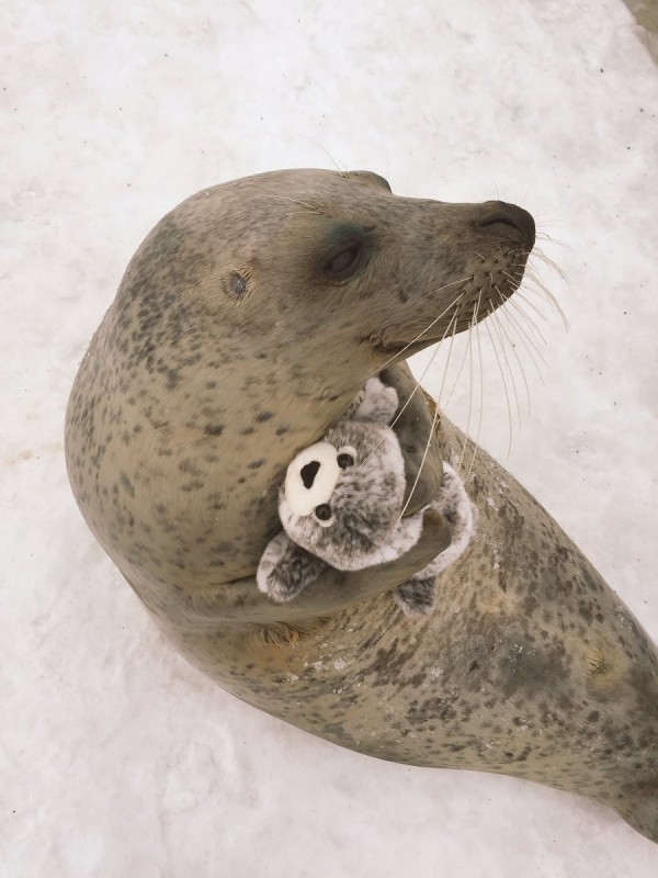 Действительно, тюлень так бережно держит игрушку, что очаровывает абсолютно всех, кто смотрит на фото.