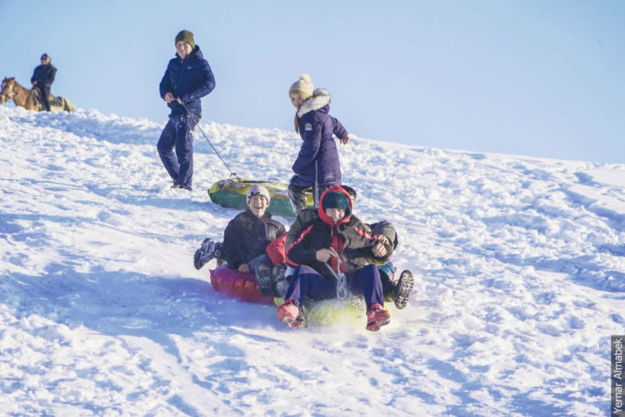 Чаще жизнь кипит у склонов, где местные устраивают горки и раскатывают их до ледяной дорожки. За тем, как катаются местные жители, интересно наблюдать. Посмотрите на их лайфхаки: надул резиновый круг для плавания, прицепил к нему веревку - и скоростные сани готовы.