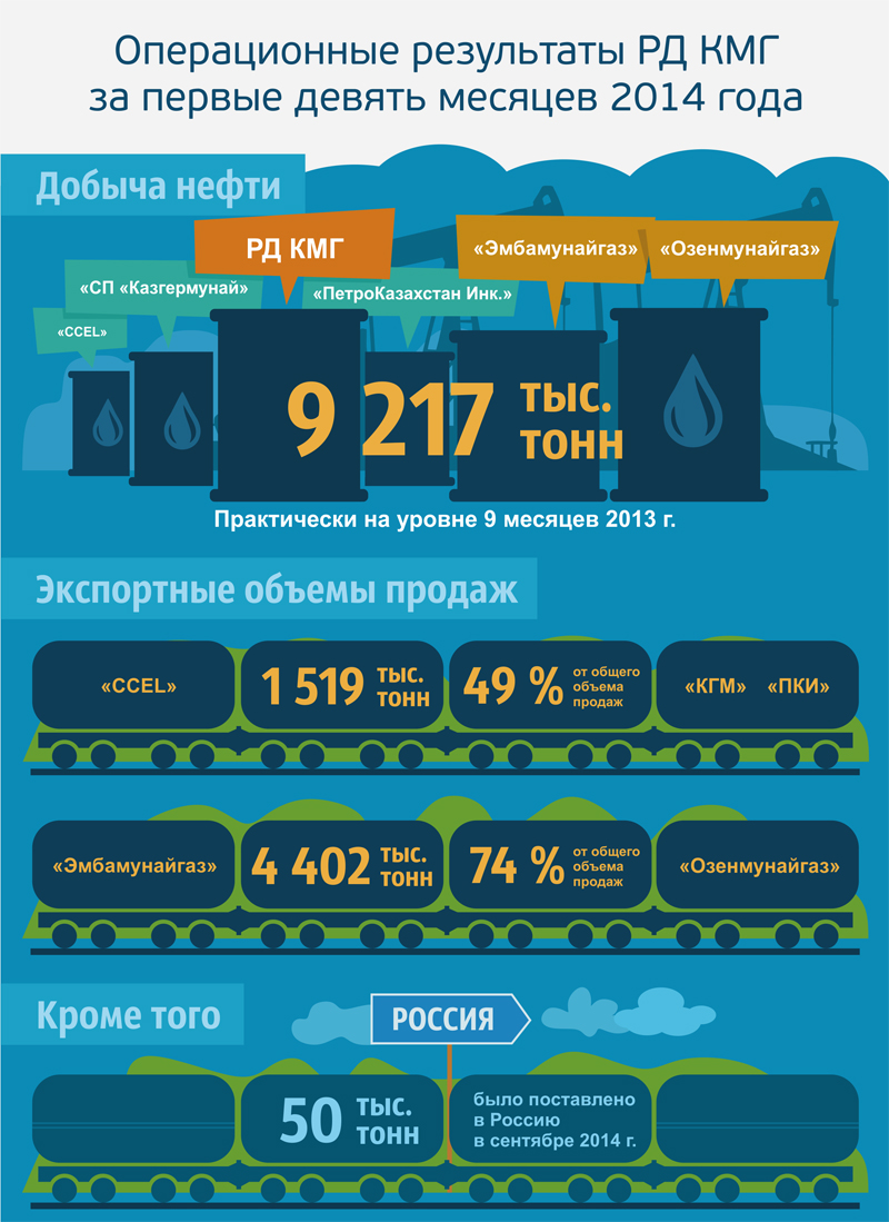 Доля от объемов продаж компаний CCEL, КГМ и ПКИ, принадлежащая РД КМГ, составила 3 089 тысяч тонн нефти или 85 тысяч баррелей в сутки, из них 1519 тысяч тонн нефти или 43 тысяч баррелей в сутки, поставленных на экспорт. Это составляет 49 процентов от общего объема продаж компаний. Экспортные объемы продаж нефти АО "Озенмунайгаз" (ОМГ) и "Эмбамунайгаз" (ЭМГ) за первые 9 месяцев составили 4 миллиона 402 тысяч тонн или 117 тысяч баррелей в сутки, или 74 процента от общего объема продаж нефти.