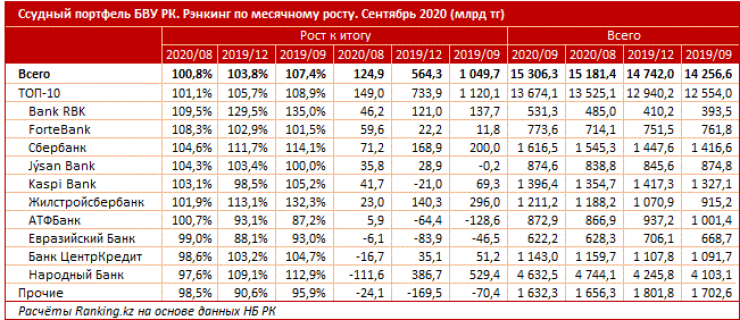 Замыкает тройку лидеров Сбербанк: плюс 4,6 процента за сентябрь, до 1,62 триллиона тенге. С начала года фининститут прибавил 11,7 процента, за год — 14,1 процента.
