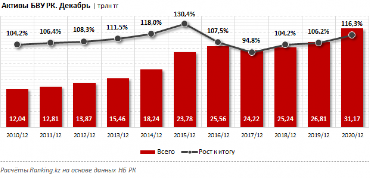 Активы казахстанских банков к началу текущего года составили 31,17 триллиона тенге - на 2,6 процента больше, чем месяцем ранее, и сразу на 16,3 процента больше, чем год назад. Нарастить активы в кризисном "пандемийном" 2020 году удалось 19 из 26 БВУ РК и 8 банкам из топовой десятки.