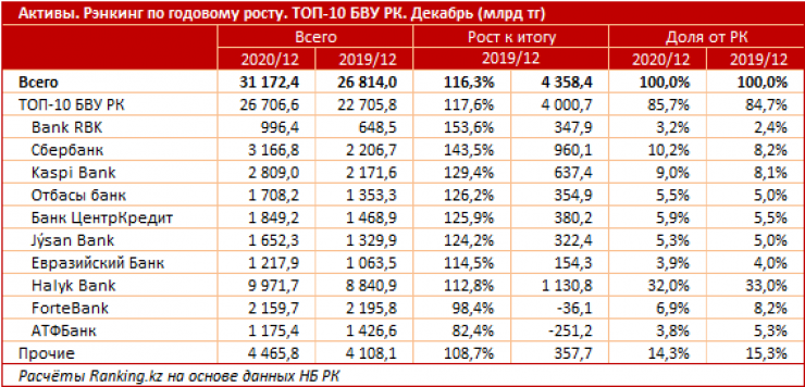 Уверенно лидирует по росту активов среди крупнейших банков страны в 2020 году Bank RBK: активы фининститута увеличились более чем в полтора раза, до 996,6 миллиарда тенге. Только за декабрь банк прибавил еще 9,3 процента (самый высокий показатель месячного роста в топовой десятке).