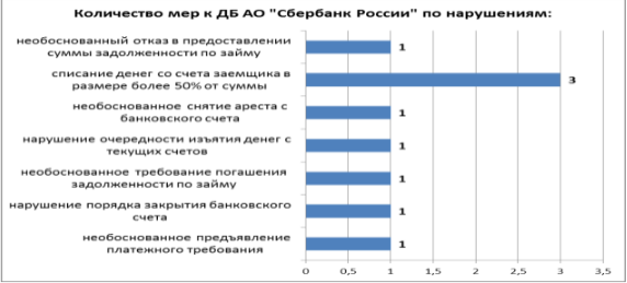 По данным Нацбанка, ограниченные меры воздействия в отношении ДБ АО "Сбербанк России" составляют 14 процентов от общего количества. Банку вынесено 9 письменных предписаний, из которых 5 - за нарушение порядка взыскания просроченной задолженности по займу, в том числе в размере, превышающем 50 процентов от денег, находящихся на банковском счете / поступающих на банковский счет заемщика.