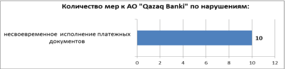 Основным нарушением АО "Qazaq Banki" стало несвоевременное исполнение платежных документов. За указанное нарушение предусмотрена административная ответственность в виде штрафа в размере 5 процентов от суммы платежного документа, но не более 200 МРП.