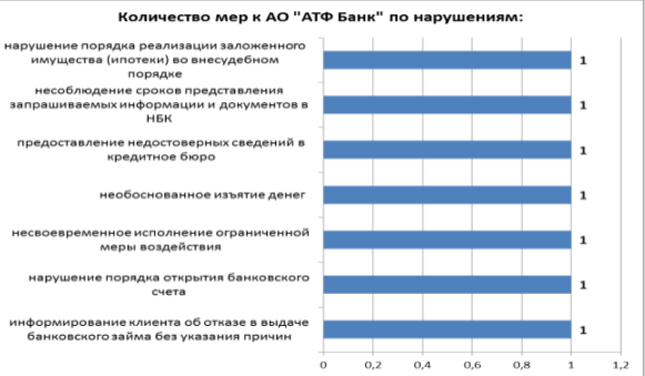 АО "АТФ Банк", как видно из диаграммы, допущены нарушения по вопросам банковского обслуживания, а также обслуживания банковского займа, что составляет 11 процентов от принятых мер в отношении банков. АО "АТФ Банк" вынесено 5 письменных предписаний, а также наложено 2 штрафа (за предоставление недостоверных сведений в кредитное бюро, а также несвоевременное исполнение ограниченной меры воздействия).