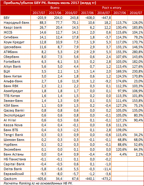 Примечательно, что на конец июня совокупная прибыль составляла 204 миллиарда тенге. В 2012 году банковский сектор уходил в минус на 1,3 триллиона тенге. В июле 2016 года прибыль БВУ РК составила 243,8 миллиарда тенге - самый высокий показатель прибыли за январь-июль после 2010 года.