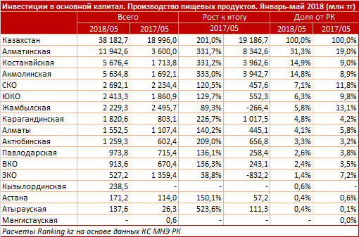 Инвестиции в производство пищевых продуктов по итогам пяти месяцев достигли 38,2 миллиарда тенге - сразу вдвое больше, чем годом ранее, сообщает Ranking.kz. Наибольший объем пришелся на Алматинскую (31,3 процента от РК) и Костанайскую (14,9 процента от РК) области.