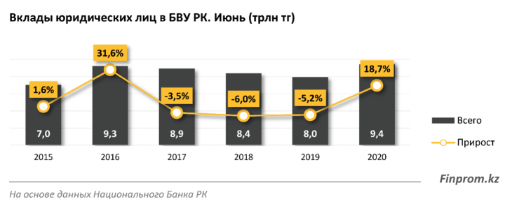 Несмотря на пандемию и осложнение ситуации в экономике, сумма депозитов юридических лиц в банках за год увеличилась на 18,7 процента и составила 9,4 триллиона тенге, сообщает Finprom.kz.