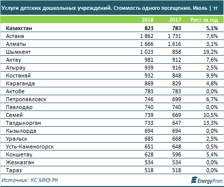 К августу стоимость каждого посещения детских дошкольных учреждений обходилась родителям дошколят в среднем в 823 тенге - на 5,1 процента больше, чем годом ранее.