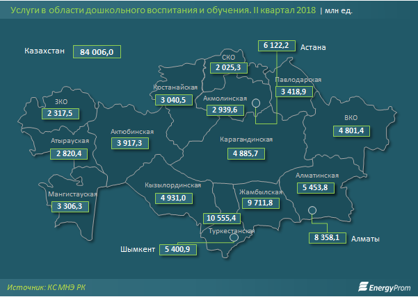 В целом услуги в области дошкольного воспитания и обучения за второй квартал 2018 года составили сразу 84 миллиарда тенге - на 16,2 процента больше, чем годом ранее.