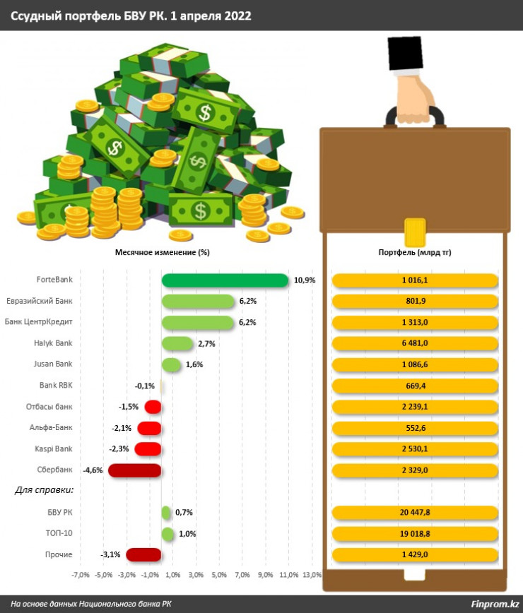 Второе место по месячному росту объема займов среди первой десятки БВУ занял Евразийский Банк, прибавивший 6,2 процента за март, до 801,9 миллиарда тенге. В годовой динамике фининститут прибавил 28,2 процента. Третье место занял Банк ЦентрКредит: плюс 6,2 процента за месяц, до 1,31 триллиона тенге. За год банк нарастил ссудный портфель на 18,2 процента. Заметим, Банк ЦентрКредит успешно завершил сделку по приобретению Альфа-Банка, который после перерегистрации будет работать под новым брендом Eco Bank. В плюсе также Halyk Bank (на 2,7 процента за март) и Jusan Bank (на 1,6 процента).
