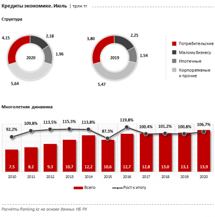 По данным аналитиков, казахстанские банки второго уровня выдали потребительских займов на 349,8 миллиарда тенге только за последний год. Общая же сумма беззалоговых кредитов достигает 4,15 триллиона тенге, что соответствует 29,8 процента от общего кредитного портфеля банков Казахстана в 13,93 триллиона тенге (рост на 6,7 процента, или 878,4 миллиарда тенге за год).
